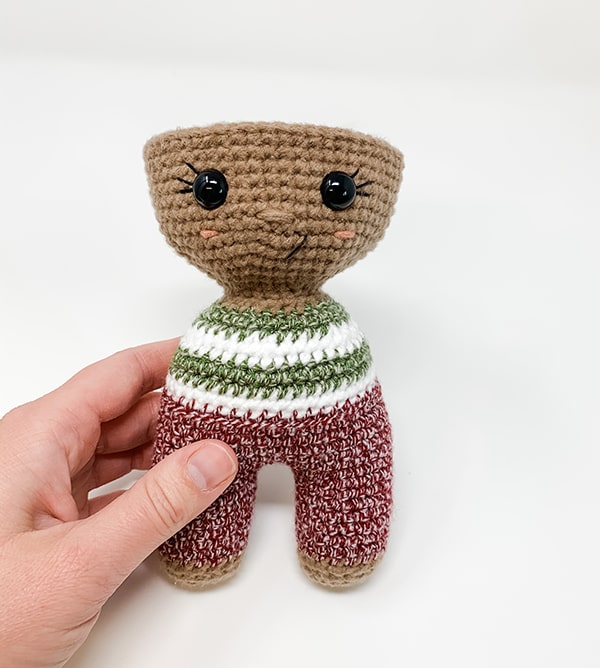 Cheeks – With pink or red yarn and your tapestry needle, pass through 2 sts just below each eye.